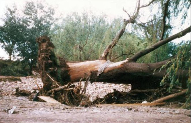 Giant trees fell victim to the rushing water. This view shows the area below the dam at Canyon Lake